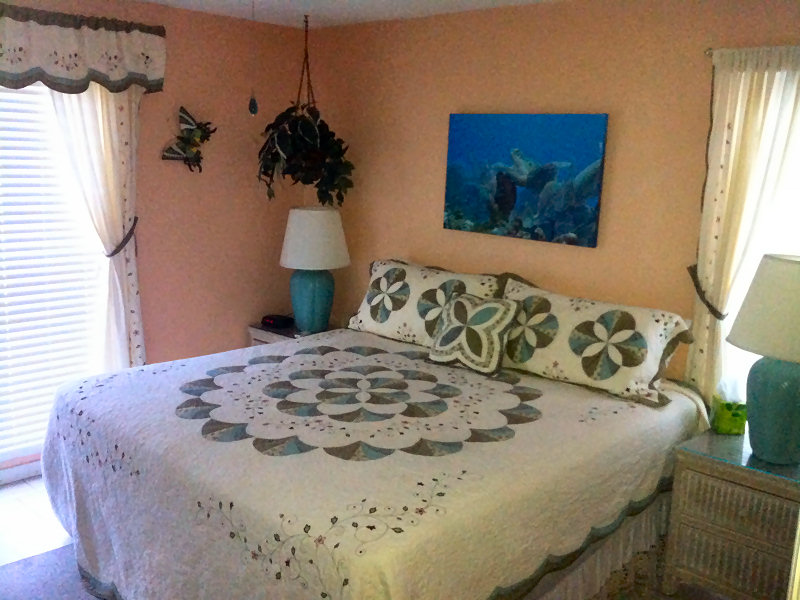 One bedroom has a king bed and the other has 2 twin beds that can be converted to a king. A/C and ceiling fans are in both bedrooms.